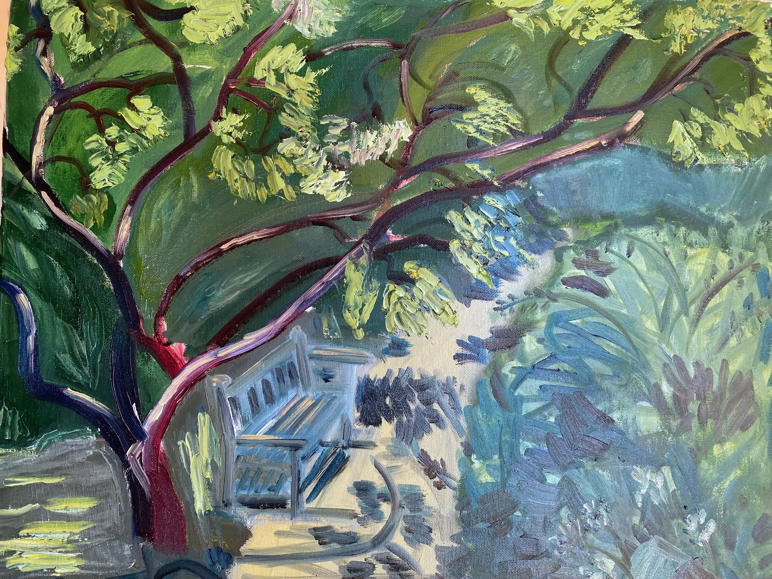 Blake Gardens Bench with Madrones. I am drawn to sunny benches, thanks to my sister and her son Rémy's rule that you should always stop and sit when you see one.