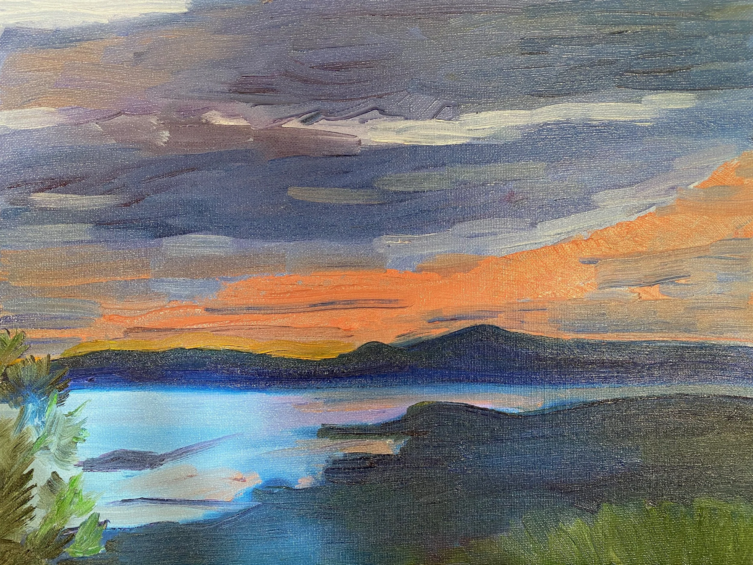 Winter sunset over the bay 11x14. Winter sunsets are the moodiest. It's the view from my bedroom, lucky me.
