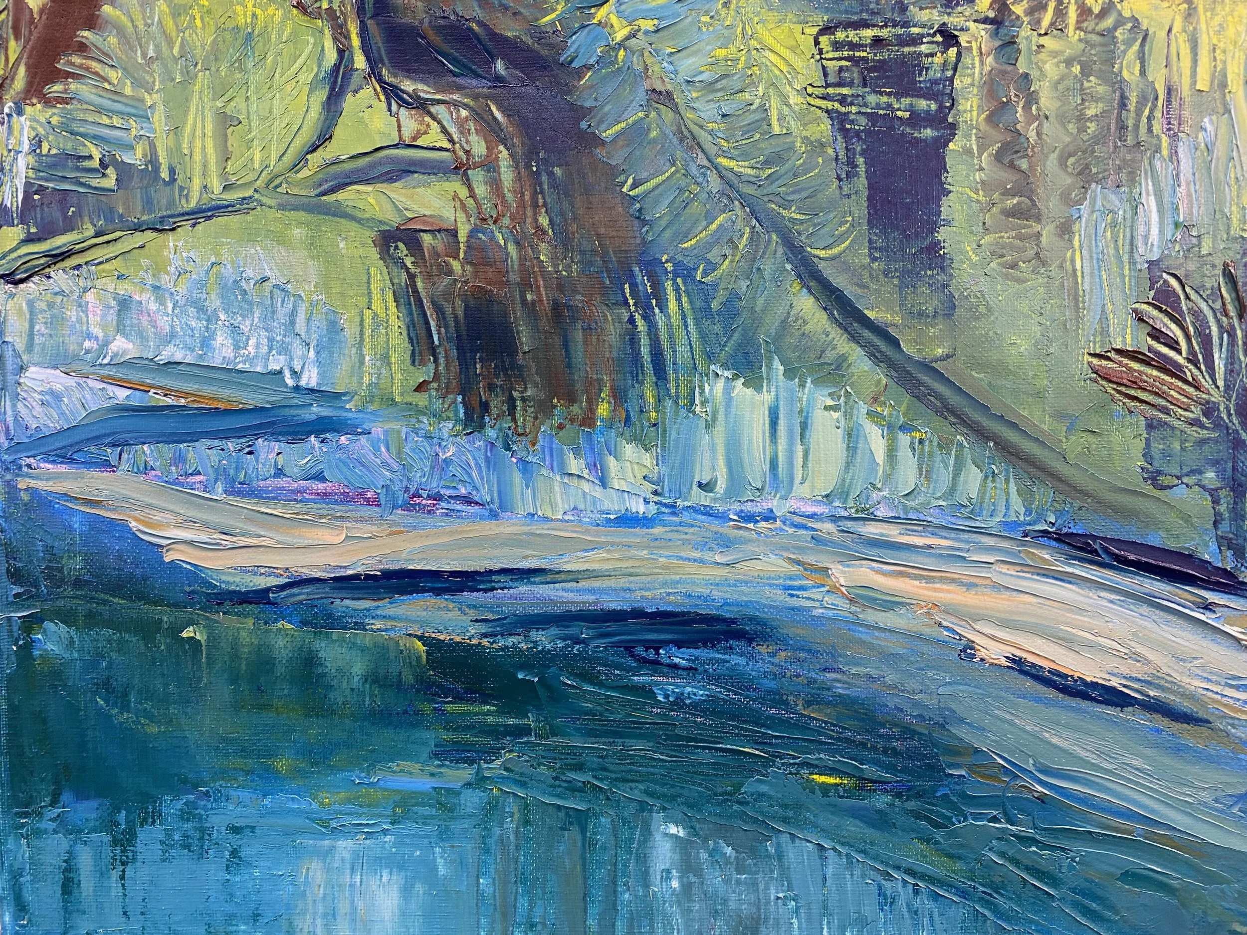 Handy Woods Dreaming-SOLD. A shady corner of the Navarro River, painted in class at the Richmond Art Center, palette knife.